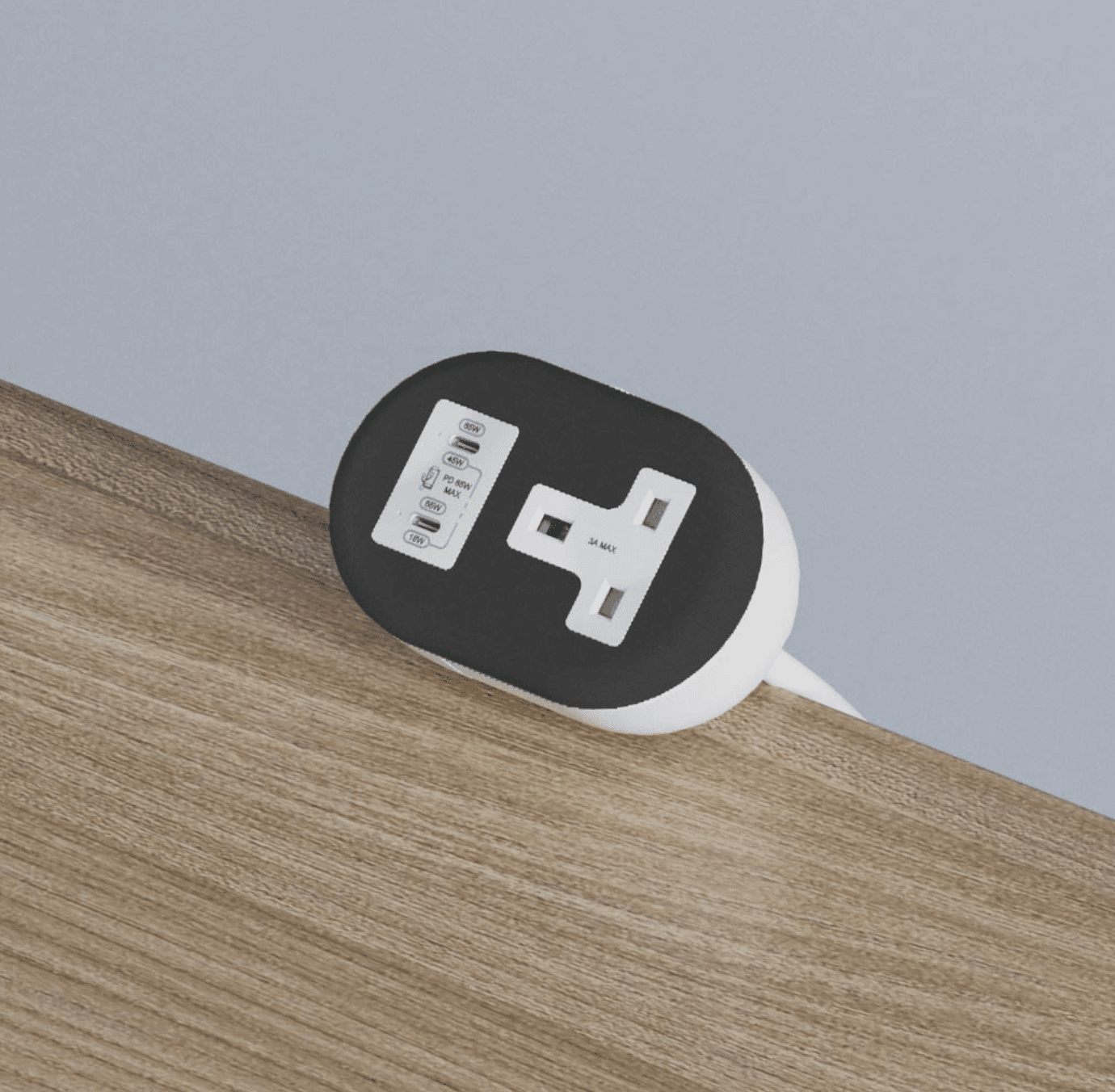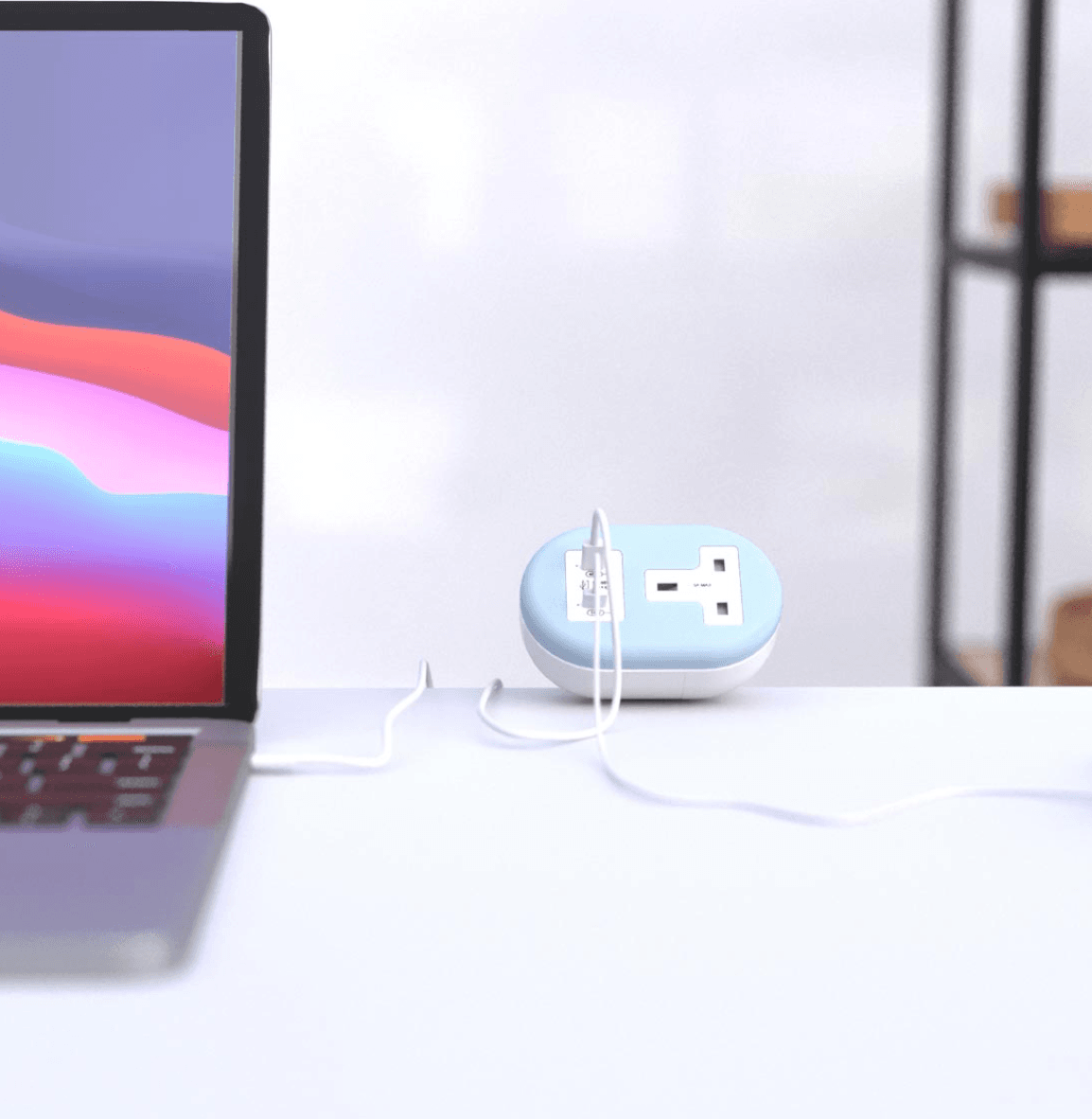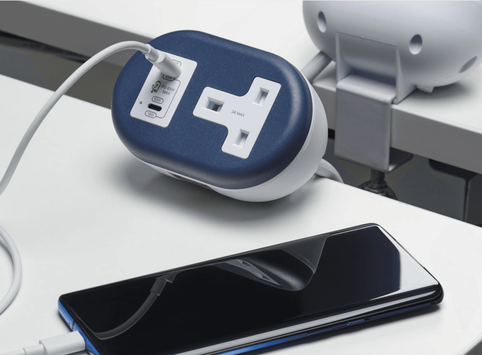 A neat and vibrant on-desk power module with a UK socket and a dual port type C adaptive fast charger, with a maximum 65W, for charging high powered laptops, tablets and smart phones.
