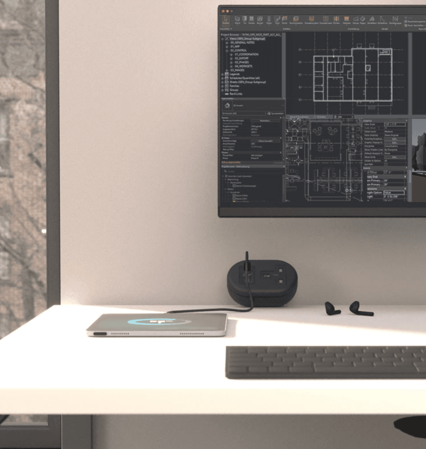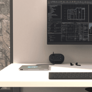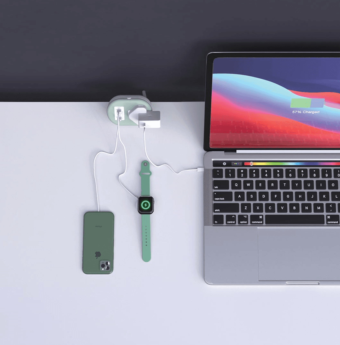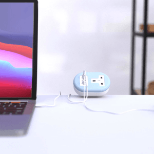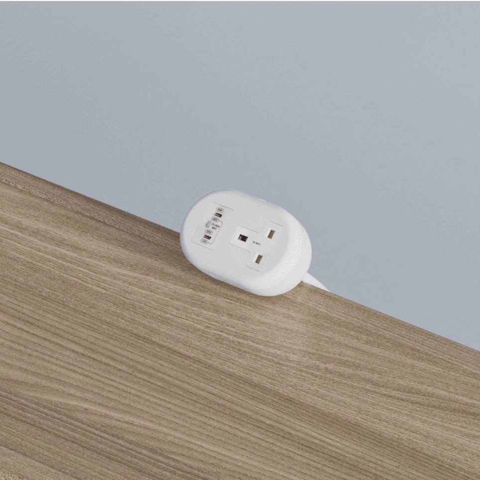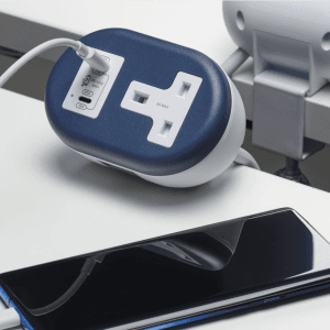 A neat and vibrant on-desk power module with a UK socket and a dual port type C adaptive fast charger, with a maximum 65W, for charging high powered laptops, tablets and smart phones.