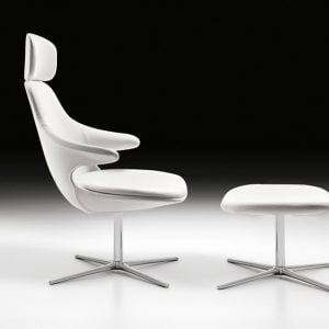 Cold-foamed polyurethane armchair, upholstered In leather, eco-leather or fabric. Aluminum base with swivel mechanism. Available pouff.